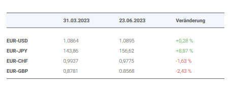 Im zweiten Quartal 2023 konnte der Euro kurzzeitig seine Stärke bis über 1,1050 gegenüber dem US-Dollar ausbauen, um dann den Terraingewinn zu konsolidieren. Im Vergleich zum Ende des ersten Quartals hat sich gegenüber dem USD kaum eine Veränderung ergeben (siehe Tabelle 3).
